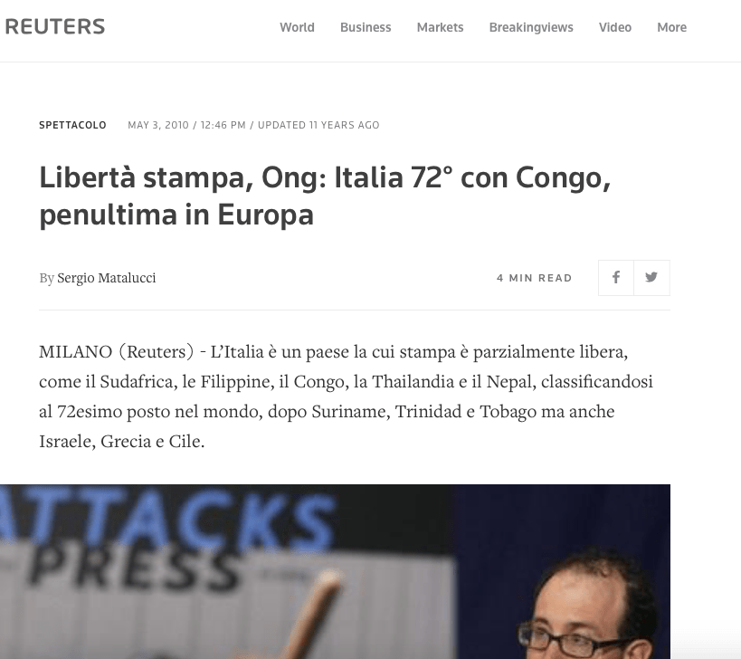 Freedom of the press, Ong: Italy 72nd with Congo, penultimate in Europe (ITALIAN) [Reuters]