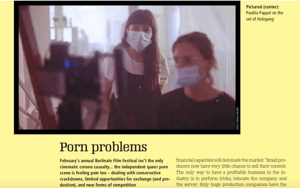 “We’re planning to start a petition to European legislators regarding the Digital Services Act, to demand equal treatment for porn platforms as any other platforms (e.g., Facebook) and to demand protection from discrimination of these hege- monic platforms,” says Pappel, adding that “Berlin is the capital for sexual innovation and deviation”… and should remain so. WHY IT IS IMPORTANT: Quoting Bruce La Bruce: “I’m tired of people looking down their noses at those who appear in or make pornography, even though they watch pornography themselves.” The story also helped me researching OnlyFans story for DW (February 2021)
