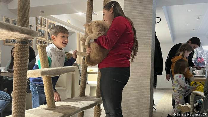 After half an hour, the children wake up, and the party starts. Some sit next to their parents, watching TV series on their cell phones. Others start playing with balls. While they chase each other around the corridors in the evening, making a hell of a noise, now they mostly sit at a table and play fairly quietly. Or they go to Cat’s Cafe, where they pet the ten cats. Incidental pet therapy.